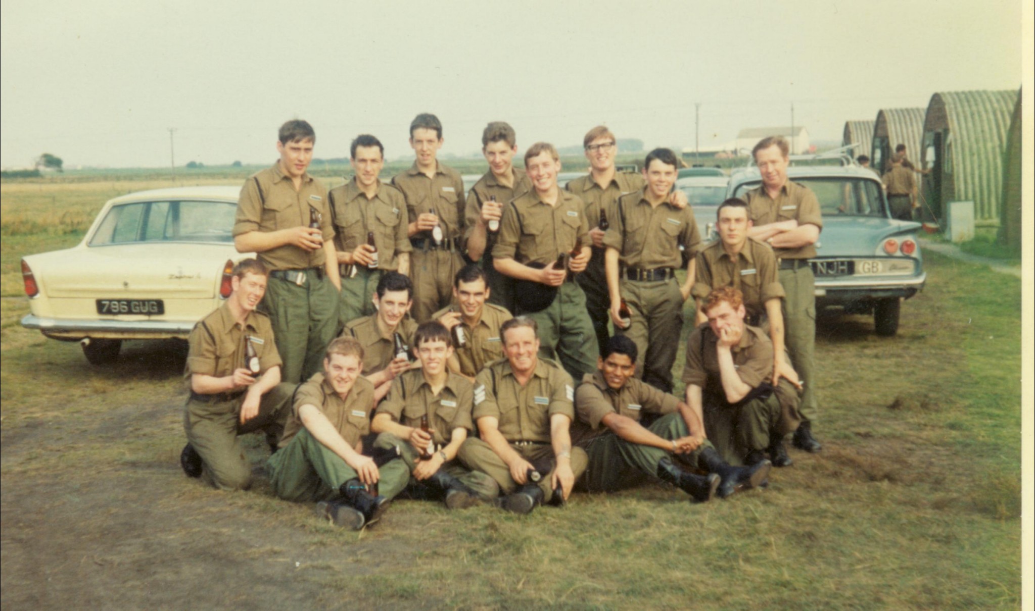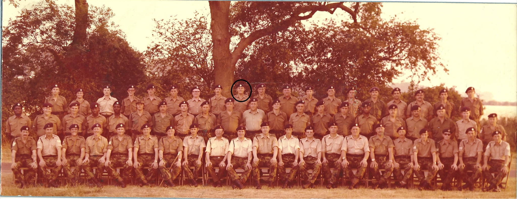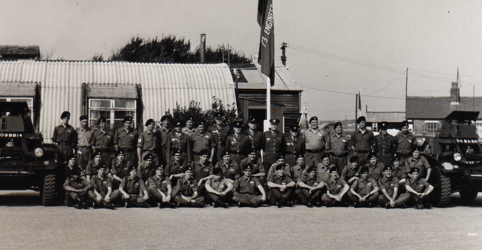 Photo courtesy of Martin Skeggs (circled)(217: 1973-1981, now in South Africa). Click photo for larger view in new window or tab From left: rear:3rd Cpl Peter Cox; 6th Peter (Doug?) Wilkinson; 7th John O'Loughlin; 9th Martin Skeggs (circled); 11th Cpl Charlie Cox; 13th, Charlie Garnish; 14th, Tony Lockett (?); centre:1st John John (yes, really) 2nd Bob Jackson; 9th Cpl Bill Orford, 10th Dave Holden; 11th Alfie Attle;13th Cpl Charlie Turner;15th Chris Wilton; 19th Tony Boxell: front: 2nd Sgt Derek Pavey (REME); 3rd Sgt John Holland; 6th Sgt Derek Scott; 7th WO2 (SSM), 10th Capt Chris Hall; 11th OC, Maj Godfrey Hope; 12th, Capt Richard Selby-Boothroyd; 15th WO2 George Orford; 17th Sgt Marrabel (?); 19th Sgt Ted Allen (dark glasses); (Webmaster's note: I've listed the names Martin and I can remember. There are only 61 all ranks here, and I'm sure there should have been more; several regular faces are missing. If you can add or correct any names or ranks please contact me) back to top of page |