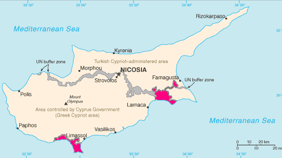 Annual Camp, 1970, Cyprus![]() In the north east of the Mediterranean, the island of Cyprus had a population of about 600,000, 80% of Greek origin and 20% Turkish (Muslim). It became a British Crown Colony in 1925, but during the 1950s ethnic Greeks began a campaign (enosis) for union with Greece leading to guerrilla warfare in 1955-59 and independence in 1960, although Britain retained its military bases and some lands around them. ![]() The British bases, known as "Sovereign Base Areas" (SBAs) are on the southern coast 60 miles apart and shown here in pink. The western one, 'Akrotiri', just west of Larnaca, is an area of about 48 square miles including RAF Akrotiri and Episkopi Military Garrison. The Eastern SBA is 'Dhekelia', which is about 50 sq. miles and has a large military base. After 42 years, I cannnot be certain, but I seem to recall that we left the UK about 20th September from Luton (presumably on a chartered civilian plane) dressed for an unseasonably cold 45˚F, and arrived 4 hours later at RAF Akrotiri where it was an unseasonably hot 80+˚F. back to top of page |