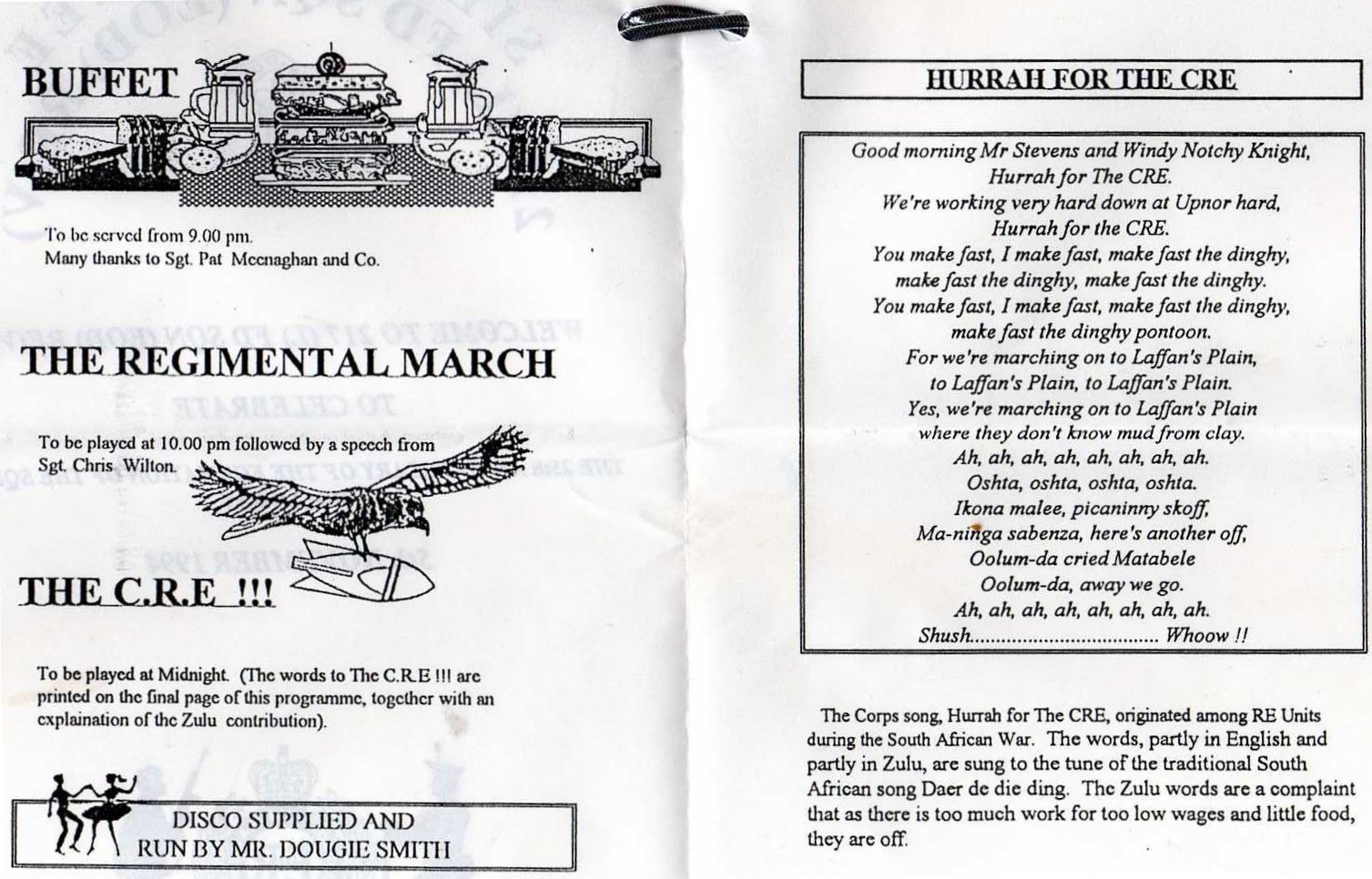 Hurrah for the CRE!At the end of RE functions, there is often a rousing rendition of one of many versions of the "Corps song". Its great if a band is on hand to drown the usually drunken singers, but unfortunately they are unlikely to be around when most needed. The song originated during the South African War of 1899-1902 (British Empire-v-Dutch 'Boers') and is sung to the tune of a traditional South African song Daer de die ding. The second part contains Zulu words which are complaints that the British gave them too much work and too little pay and food, and so they were leaving. Every sapper knows the opening "Good Morning Mr Stevens" but after that it's a bit hazy. Each unit seems to have its own version, with words changed over time by misunderstanding, by accent and by local wags. There seems to be an almost total lack of knowledge of the Zulu bits. When circumstances allow, the gathering should form a chain, each with their hands on the shoulders of the one in front. The chain then winds around with everyone singing, or attempting to, quite loudly. The closing "Ah, ah, ah" should start from a fairly high note and gradually descend. At each "Ah" the singers sink down a little until resting on their heels. There follows a short silence, then a whispered "Shuush", another short silence, then everyone jumps up and shouts "Whooh!" (or Hurray! or Hurrah!") So to end this webpage, please play the brilliant little video below. Make sure your speakers are on and join in, using whichever version you want. Hurrah for the CRE! I am endebted to You Tube and to "Jack Frost" (of Ely?) who uploaded the above and describes himself thus: "I was a Royal Engineer, I was a commercial diver. I was a Police Officer, I am an Ambulance driver." And obviously a very competent video maker too. Thanks Jack. |