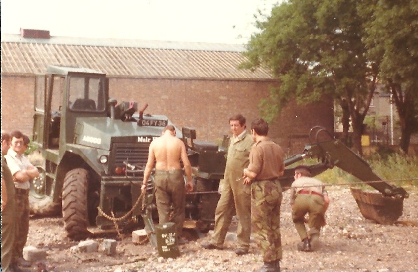 At Holloway RoadJust a couple of scenes taken at the Drill Hall.Must be hundreds more out there guys, please see what you can dig out. ![]() Photo courtesy of Martin Skeggs (217: 1973-1981) Plant Troop's Muir Hill LWT with back-acter (back-hoe) extended and the tractor in four-wheel steer mode. Left to right: L/Cpl Bob Jackson (Plant Trp), Charlie Garnish (facing camera), someone wearing beret and glasses, Cpl Bill/Billy Orford (Plant) with bare back, Dave Holden (Plant), Doug Wilkinson (I think) and Plant Trp Sgt Ted Allen just ducking under the rope. Does the LWT have a hydraulics problem? And where's that winch rope going to? Mid/Late 70s? |